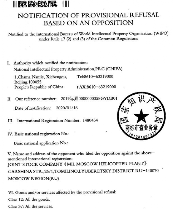 三聚陽(yáng)光代表異議人米里莫斯科直升機(jī)廠(chǎng)股份公司于2019年12月對(duì)被異議商標(biāo)第G1480434號(hào)基于近似的理由提出異議申請(qǐng),并提供大量證據(jù)?,F(xiàn)國(guó)家知識(shí)產(chǎn)權(quán)局下基于該異議申請(qǐng)駁回了第G1480434號(hào)商標(biāo)的中國(guó)注冊(cè)申請(qǐng)。