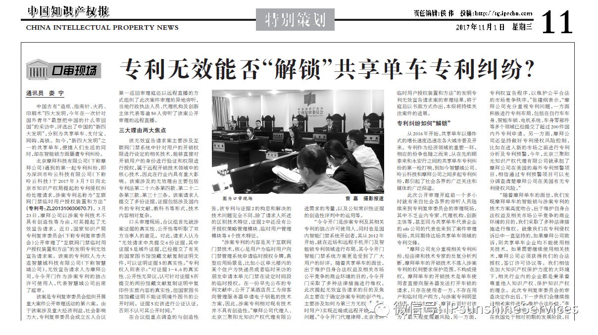9月27日,專利復審委員會組織對該案進行公開審理。該案是專利復審委員會組織開展重大案件公開審理活動的第六案。由于該無效宣告請求案主要涉及互聯(lián)網(wǎng)門禁系統(tǒng)中針對用戶的開鎖權限進行設定的相關技術,能夠直接對開鎖用戶的身份進行驗證和權限進行授權,屬于遠程開鎖技術領域中的核心技術,因此在行業(yè)內(nèi)具有重大影響,涉及重大經(jīng)濟利益,社會影響力大,專利復審委員會成立五人合議組對其進行審理,合議組成員由相關技術領域?qū)彶闃I(yè)務專家及法律專家擔任。三聚陽光張建綱、周美華、吳黎三位律師出庭參審。近100人現(xiàn)場旁聽了該案審理?!吨袊R產(chǎn)權報》11月1日刊發(fā)題為《專利無效能否“解鎖”共享單車專利糾紛?》的文章,專題報道了該案。