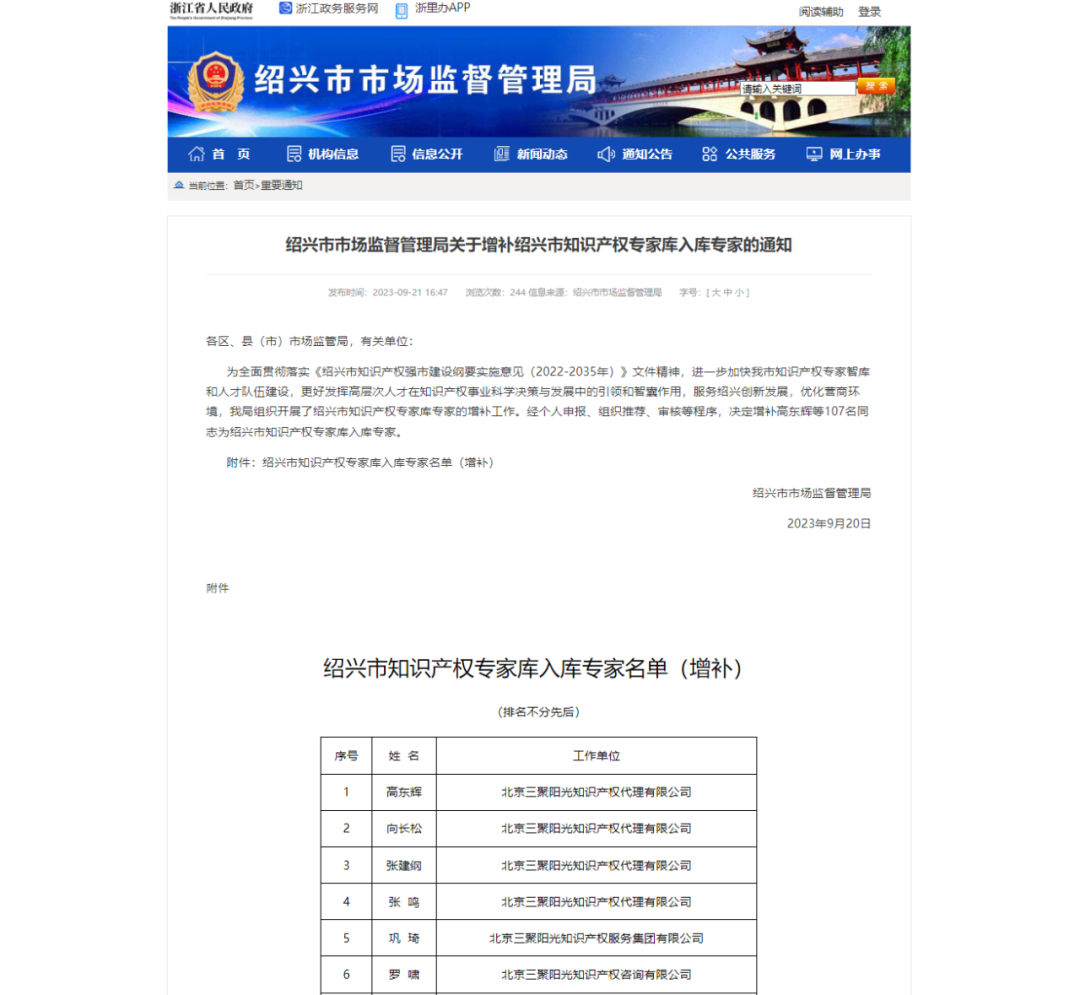 近日,紹興市市場監(jiān)督管理局公布紹興市知識產(chǎn)權(quán)專家?guī)烊霂鞂<颐麊危ㄔ鲅a(bǔ)),三聚陽光集團(tuán)總裁張建綱、副總裁高東輝、向長松、張鳴、鞏琦、羅嘯六位專家入選。?