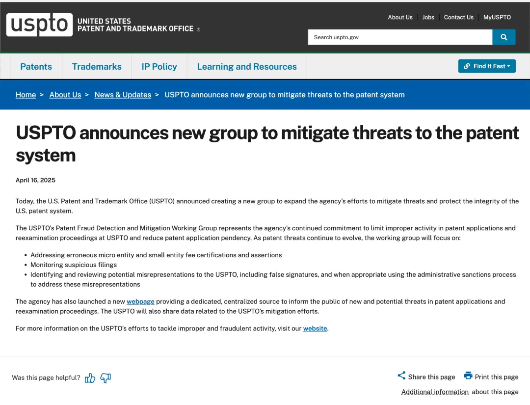 美國專利商標局(USPTO)于2025年4月16日正式宣布成立一個全新的工作組——專利欺詐檢測和緩解工作組 (The USPTO’s Patent Fraud Detection and Mitigation Working Group)。這一舉措明確顯示了USPTO意圖加強對專利申請及復審程序中不當行為的監(jiān)管力度,旨在維護美國專利制度的嚴肅性和公信力。