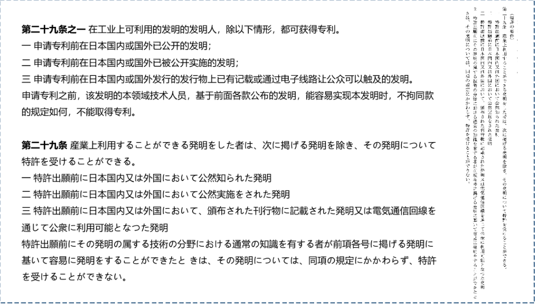 日本對(duì)新穎性的定義主要基于第二十九條,原文如下圖。該條法案被認(rèn)為提出了授予專利的條件,包括實(shí)用性(“工業(yè)上可利用”)、新穎性(列舉現(xiàn)有技術(shù)情形)、創(chuàng)造性(基于現(xiàn)有技術(shù)容易實(shí)現(xiàn)的不可專利)。