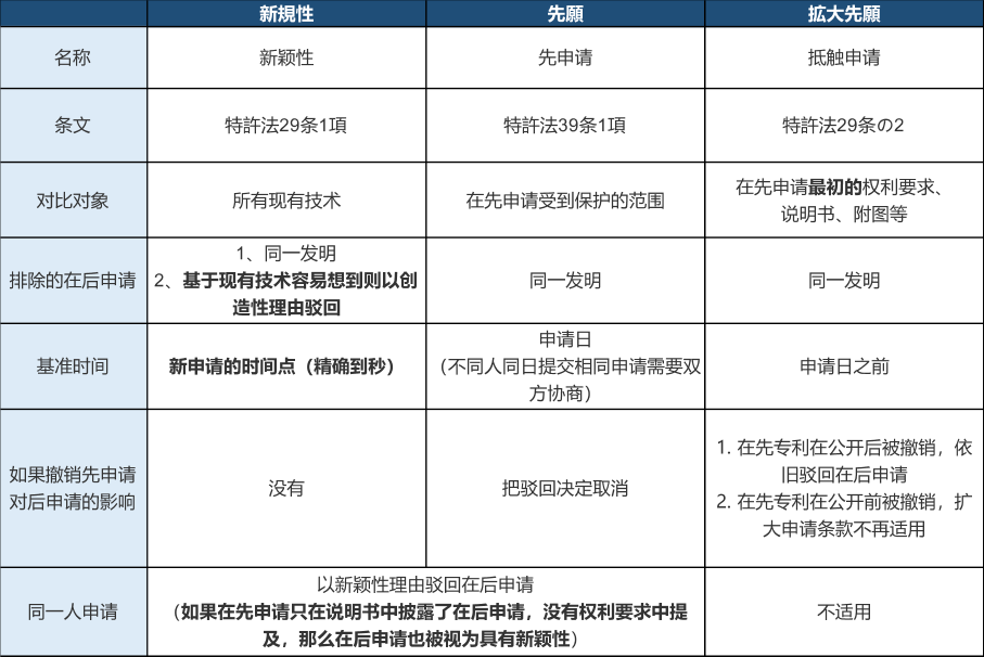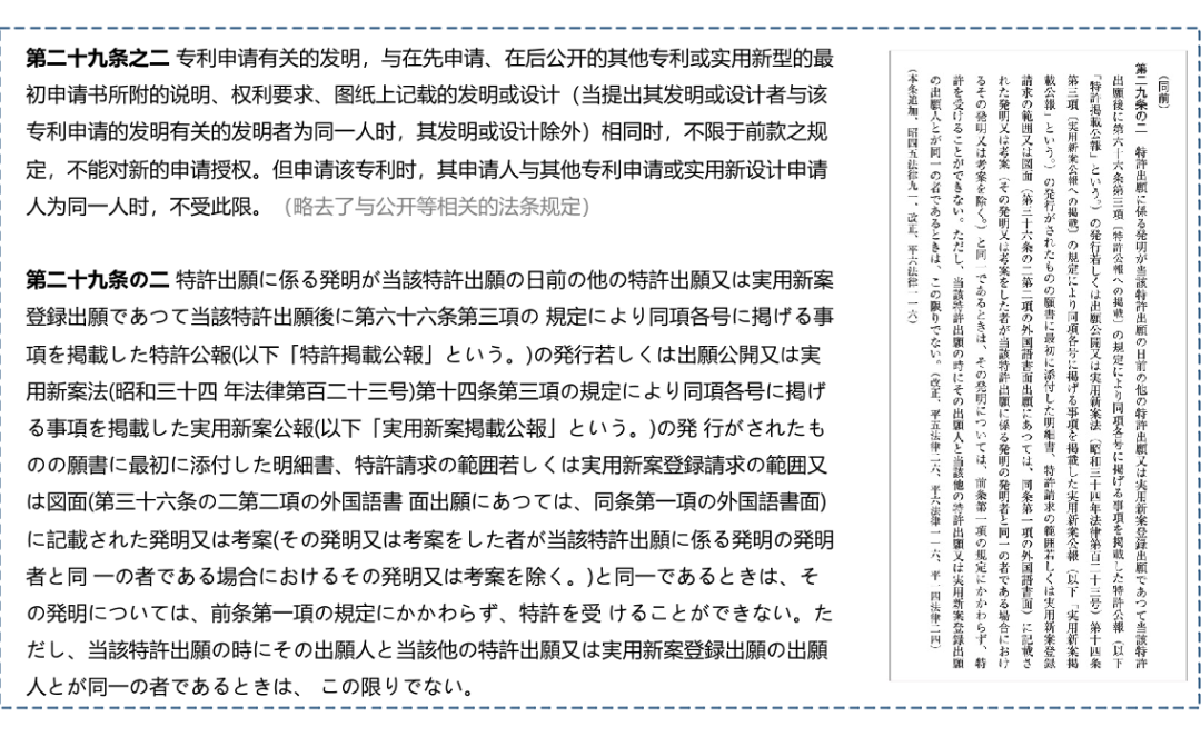 特別要注意,由于以上歷史原因,日本的“抵觸申請(qǐng)”條款不包含同一申請(qǐng)人或同一發(fā)明人的情形,所謂“相同”指代發(fā)明人完全相同或申請(qǐng)人完全相同。如果在先在后提交的兩份相同的申請(qǐng)的發(fā)明人全部相同或申請(qǐng)人全部相同,日本專利局不依據(jù)“擴(kuò)大先愿”駁回,轉(zhuǎn)而依據(jù)第三十九條「先願(yuàn)」的先申請(qǐng)制度,基于在后申請(qǐng)沒有「新規(guī)性」駁回。駁回的結(jié)果一樣,只是依據(jù)不同。中國則沒有這一例外。