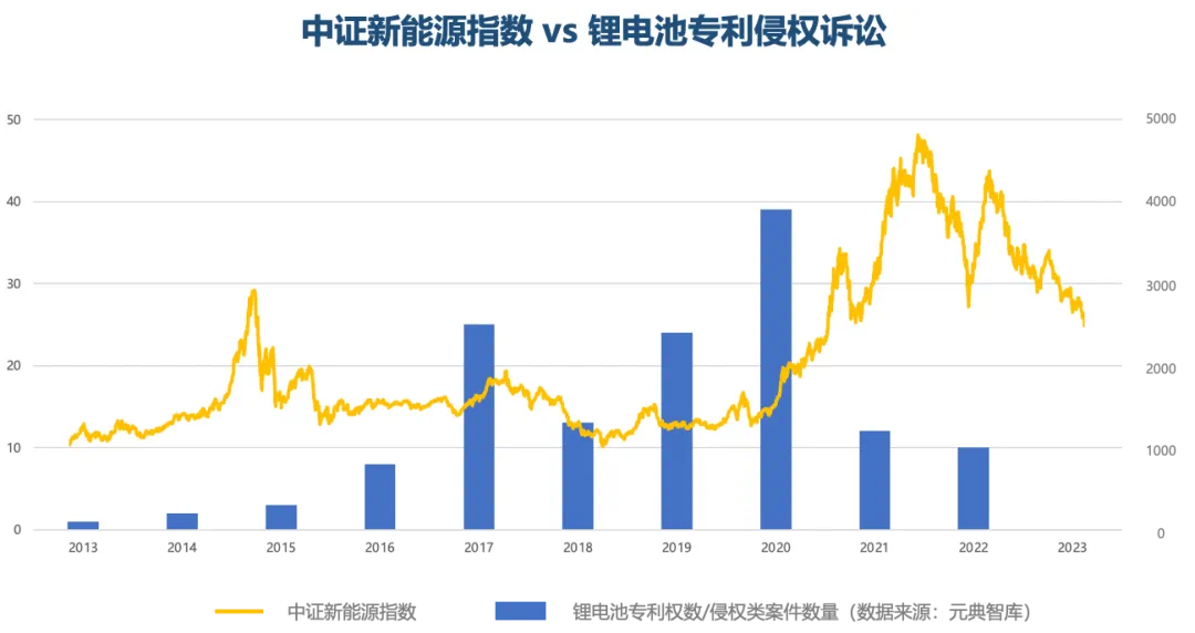 我國鋰電池行業(yè)呈現(xiàn)5-6年一大周期的規(guī)律,行業(yè)的專利訴訟也呈現(xiàn)出相似的周期。簡單對比中證新能源指數(shù)與鋰電池專利侵權(quán)訴訟案件數(shù)量,可以非常直觀地看出,案件數(shù)量高峰幾乎完美避開了投資市場的景氣高峰、非常契合投資熱度的低谷。