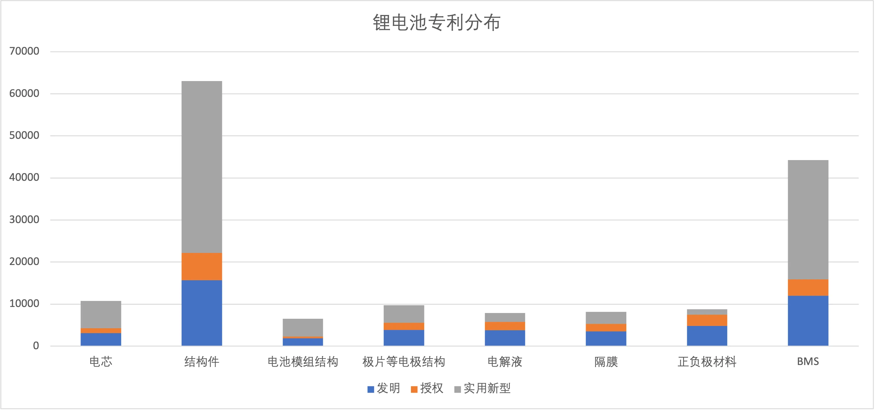 下圖是粗略檢索(未去重、未清洗)的分布結(jié)果,只為呈現(xiàn)基本的專利數(shù)量趨勢。結(jié)構(gòu)件種類多、創(chuàng)新門檻相對材料等低,是專利申請的大頭;BMS由于包含了熱管理、保護電路等,創(chuàng)新門檻同樣相對較低,所以專利數(shù)量也較多。但是動力電池的形態(tài)只有方形、軟包、圓柱,主流工藝就是卷繞和疊片,結(jié)構(gòu)件及電芯結(jié)構(gòu)專利沖突多幾乎是必然。